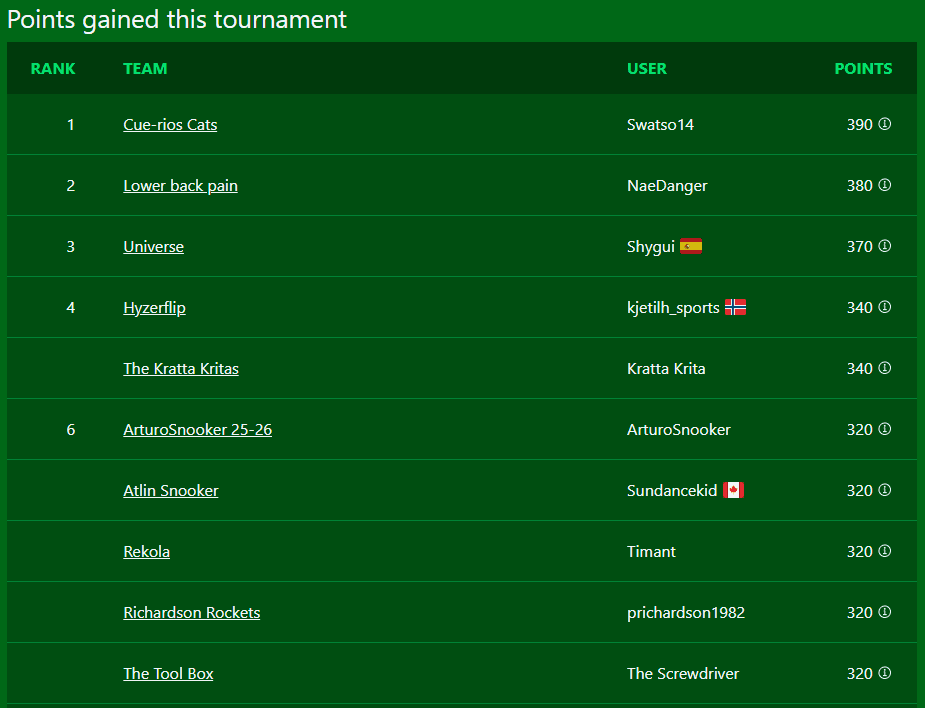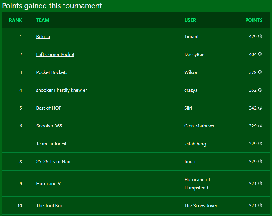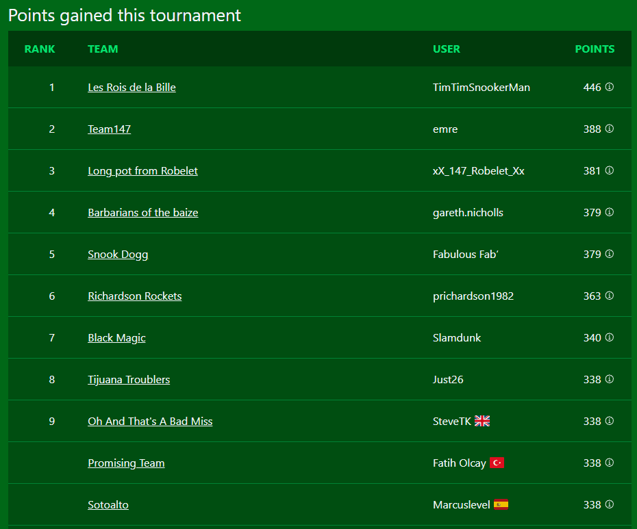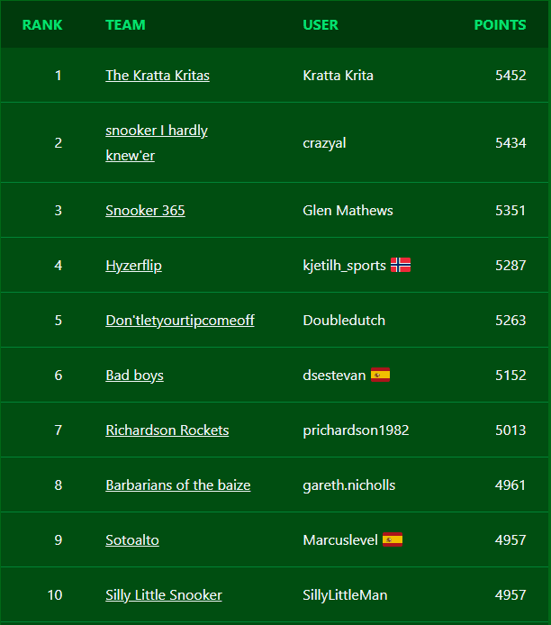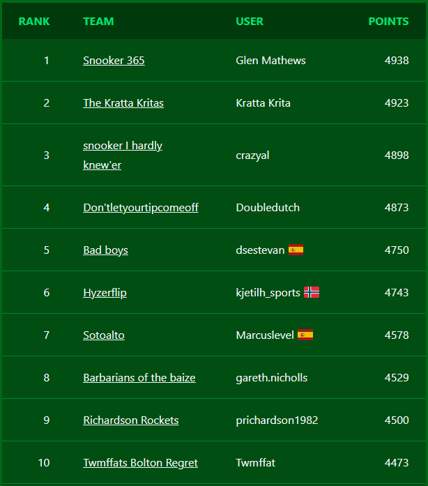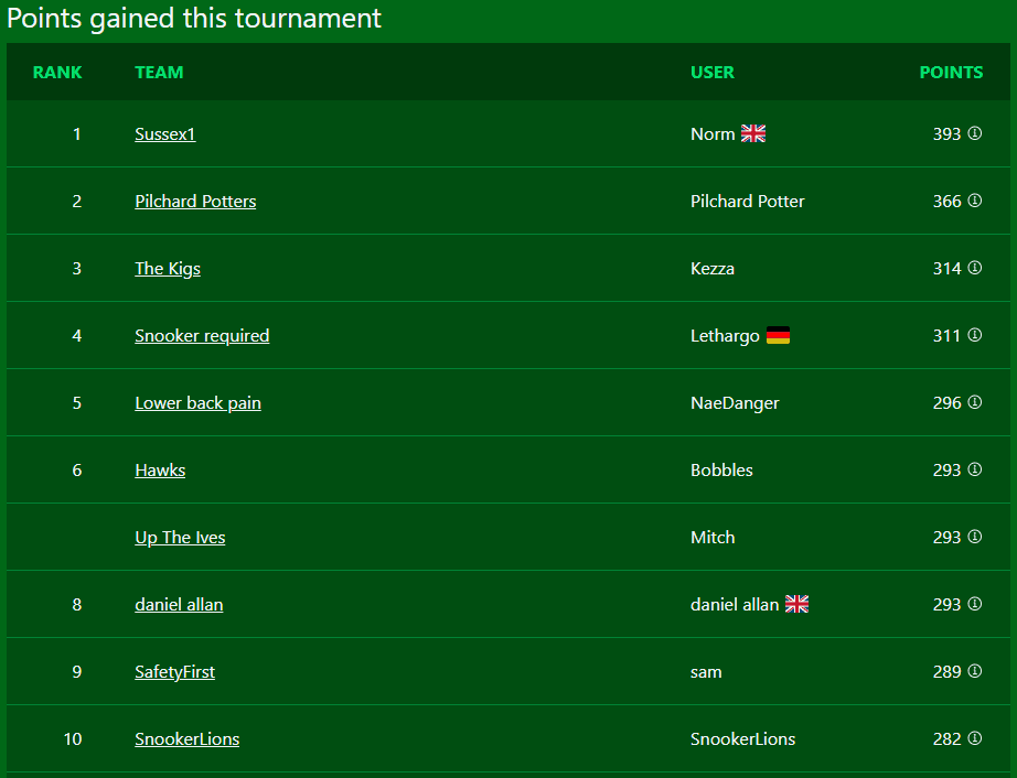 Fantasy Snooker is a free game where you build a team of snooker players and score points based on how well they do in actual tournaments.