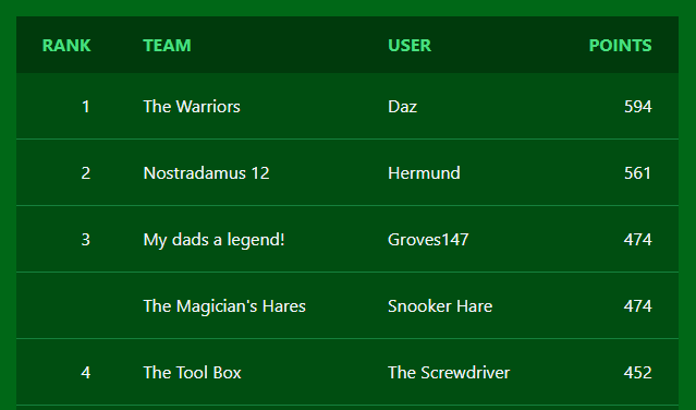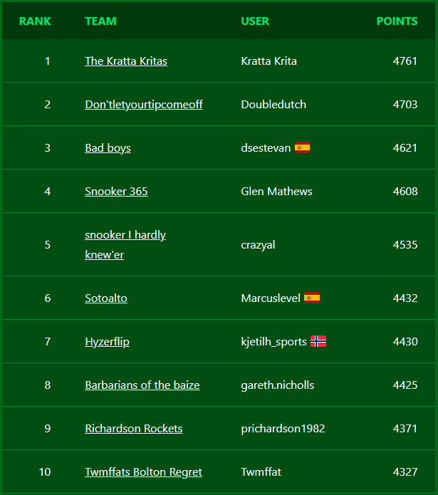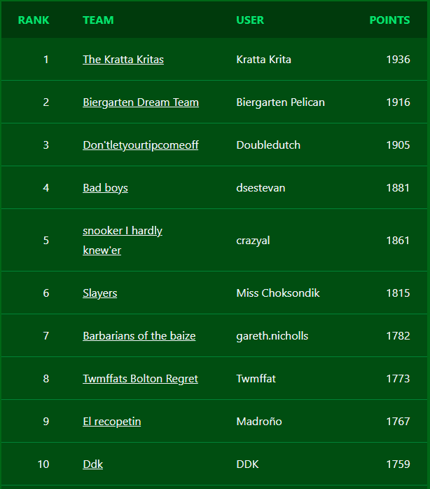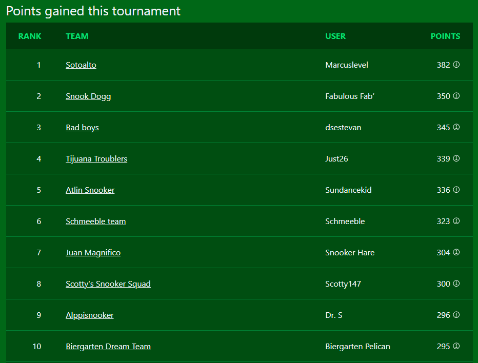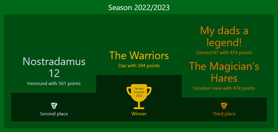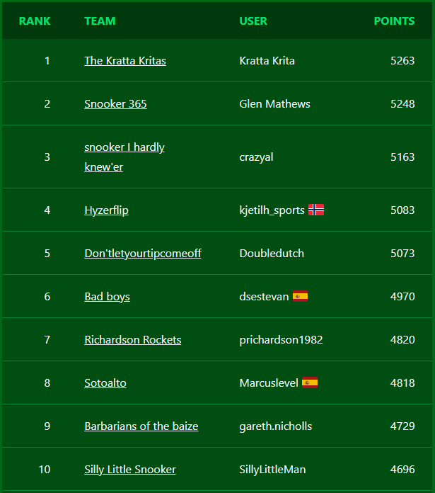Fantasy Snooker is a free game where you build a team of snooker players and score points based on how well they do in actual tournaments.